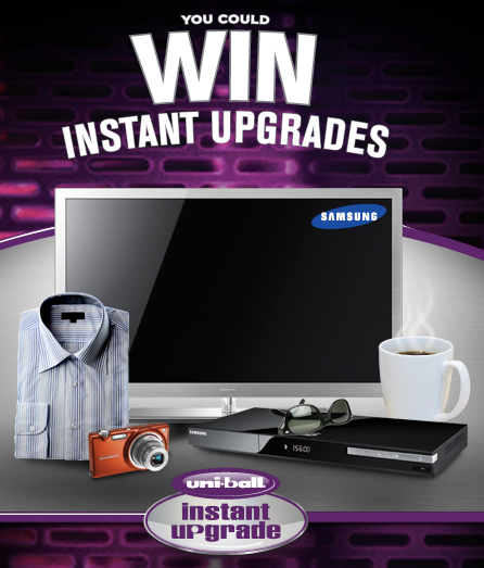 Uni-Ball Facebook page, Like them, and click on the Enter Your Code tab on left-hand side to play the Uni-Ball Instant Upgrade game. You'll need to get a code found inside specially marked packs of Uni-ball pens or click "Need a code?" to receive 3 codes in your inbox (may take up to 30 minutes to receive) for a chance to win prizes from brands like Samsung, Banana Republic, Sunglass Hut, Starbucks, and more.